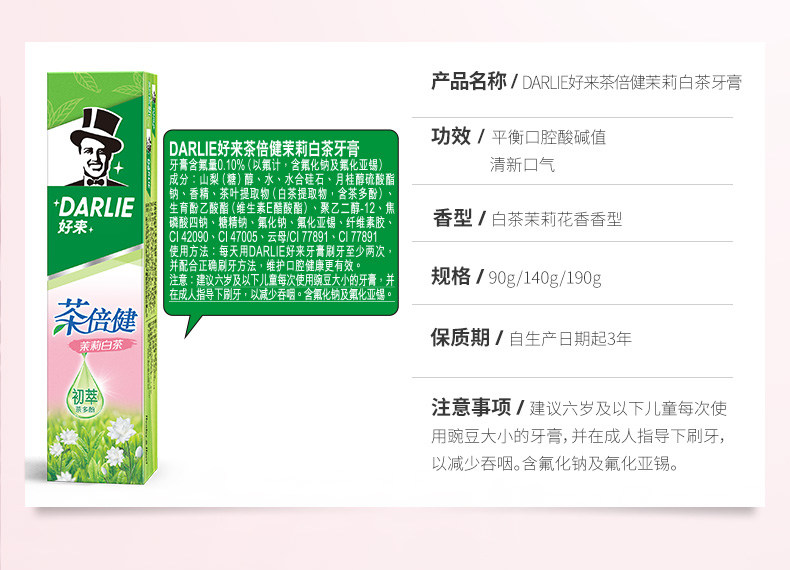 商品名称:DARLIE好来(原黑人)牙膏茶倍健茉莉白茶140g护龈去除牙菌斑亮白